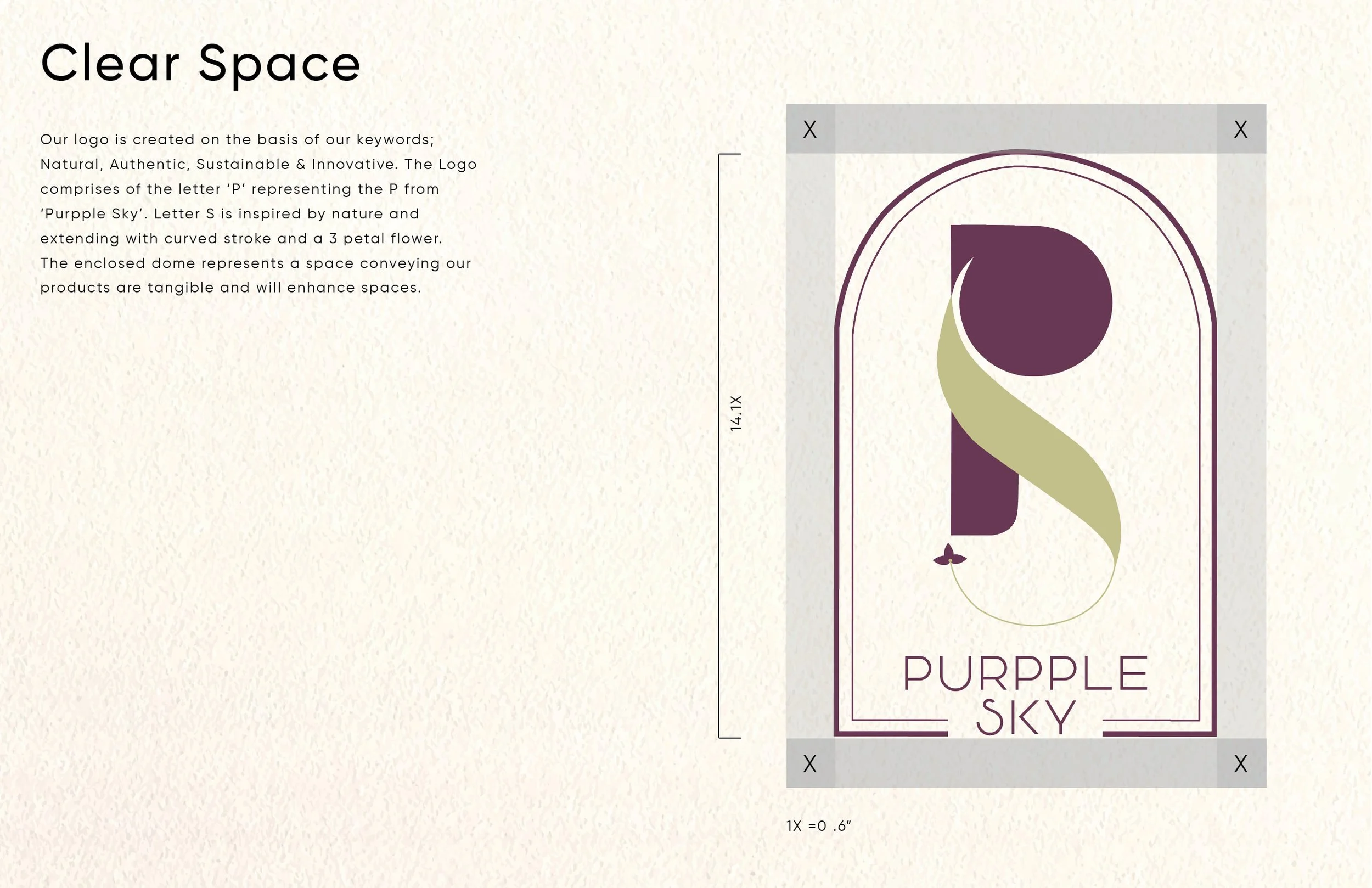 The logo is created on the basis of our keywords; Natural, Authentic, Sustainable & Innovative. The Logo comprises of the letter ‘P’ representing the P from ‘Purpple Sky’. Letter ‘S’ is inspired by nature and extending with curved stroke and a 3 petal flower. The outer dome is set at 3pt stroke and inner dome is set at 1pt stroke. The enclosed dome featured in the logo draws inspiration from classic and timeless arch windows, serving as the cornerstone of the brand’s fusion of classic and modern elements.